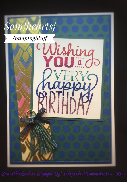 This card shows some of the papers in the bundle with Dapper Denim cardstock and also here you can see one of those little tassels that you get in Premier bundle. Now I did not have any ribbon in the new Tranquil Tide in-color... but I did have white grosgrain and I did have a lovely fresh new ink pad, so after getting really inky and heat setting with my heat gun, I got a bow that was not perfect but nearly there! The sentiment is from Big on Birthdays stamp set and I got out my daubers and firstly rainbowed the DSP and then carefully rainbowed the stamp :) I love a rainbow.